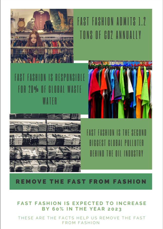 The next contribution I made to the project was in relation to creating content. This involved creating the slogan of the groups campaign as well as creating a poster for our digital marketing campaign. After conducting research and getting approval from the group the slogan that was created was “ Remove The Fast From Fashion” this slogan then became the centre of all content created by the group including the poster that I created which contributed to my blog. This poster contained facts about the pollution and damaged caused by the fast fashion industry.